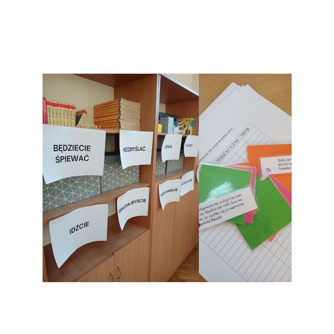 W różnych miejscach rozwieszamy kartki A4. Na przedniej stronie znajduje się czasownik w formie osobowej, na drugiej – określenie jego formy.