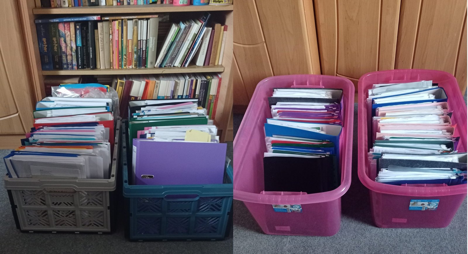 Pakowanie wszystkiego do segregatorów jest kiepskim pomysłem. Jeśli włożysz każdą formę wypowiedzi do tej samej teczki, to albo będziesz za każdym razem dźwigać cały pakiet (chociaż potrzebujesz tylko kserówek np. z rozprawki), albo wyciągniesz to, co jest ci potrzebne – jednak z doświadczenia wiem, że raz zabrane materiały nie wrócą nigdy na swoje miejsce, a na koniec roku znowu na biurku straszyć będzie stos nieuporządkowanych kartek (zaraz obok polonistycznej wieży wstydu z książek „do przeczytania”). Jaki mam na to sposób? Używam skoroszytów. Są węższe i lżejsze od segregatorów (mój kręgosłup na starość mi za to podziękuje).