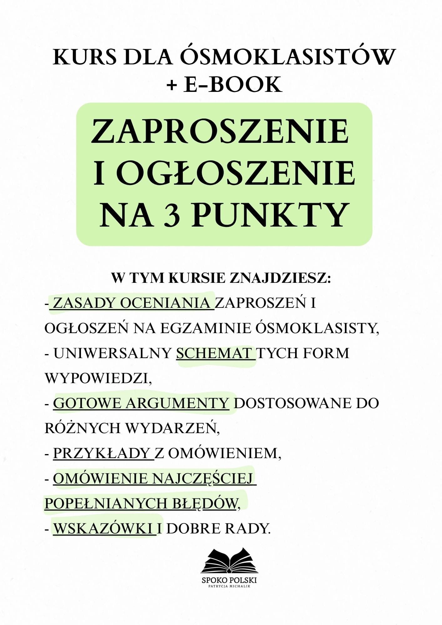 Kurs dla ósmoklasistów z pisania zaproszeń i ogłoszeń + e-book